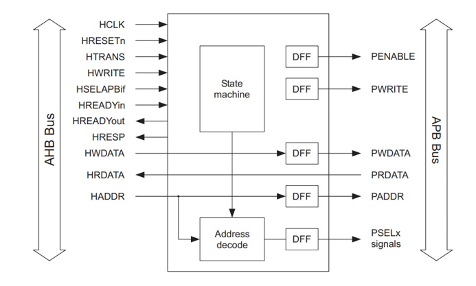 The AHB to APB bridge acts as a mediator between the AHB and APB buses, enabling communication between them. It translates the signals used by each bus, allowing devices connected to the APB bus to be accessed by the microprocessor through the AHB bus.